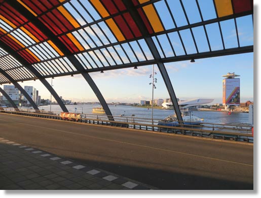 Dann hieß es Abschied nehmen von Amsterdam, mit einem letzten Foto unseres täglichen Ankunftortes am Bahnhof, mit Blick auf das Hafenbecken... Und weiter geht die Reise durch die Niederlande...